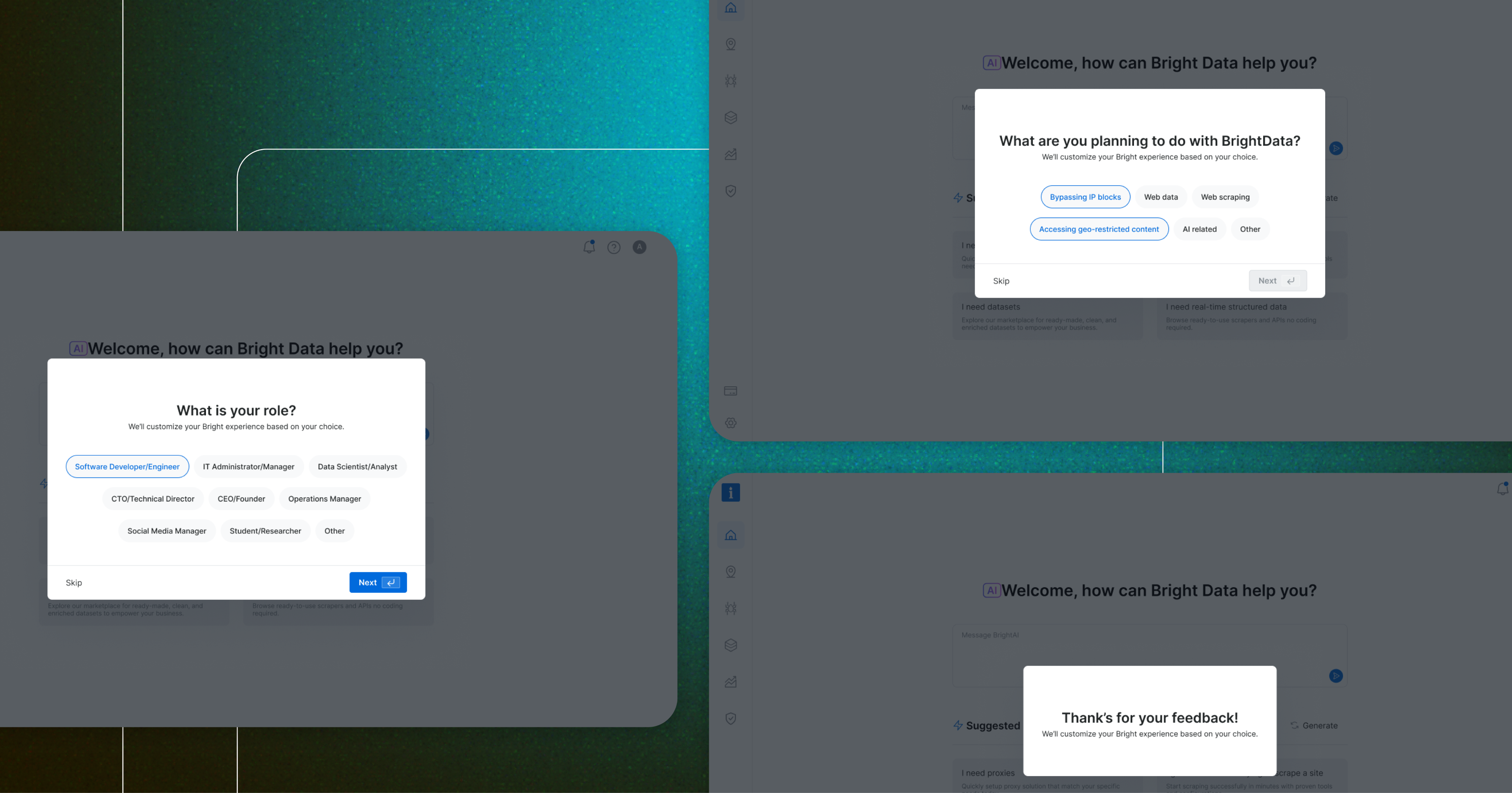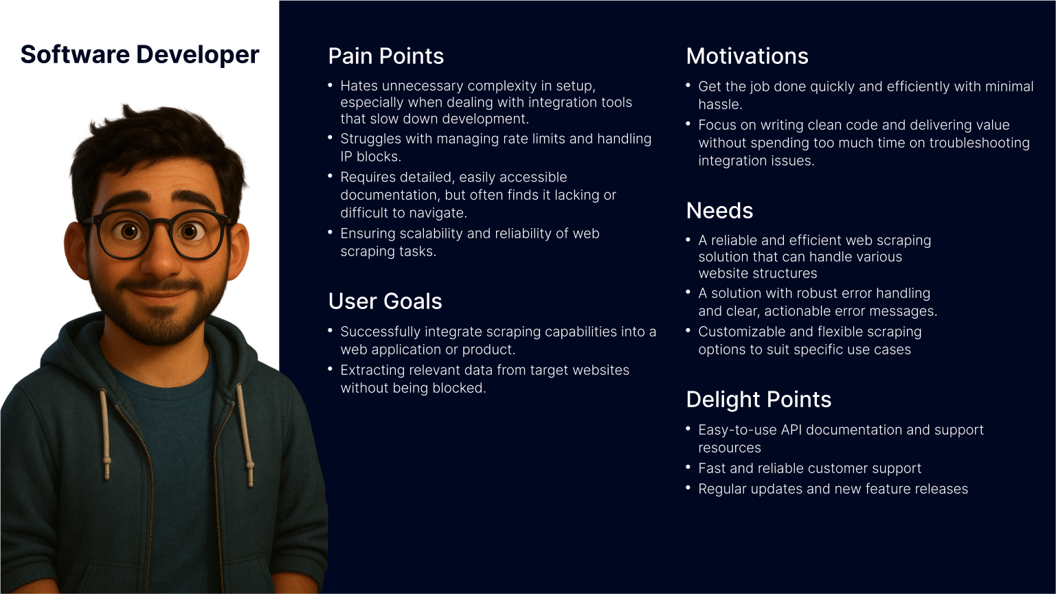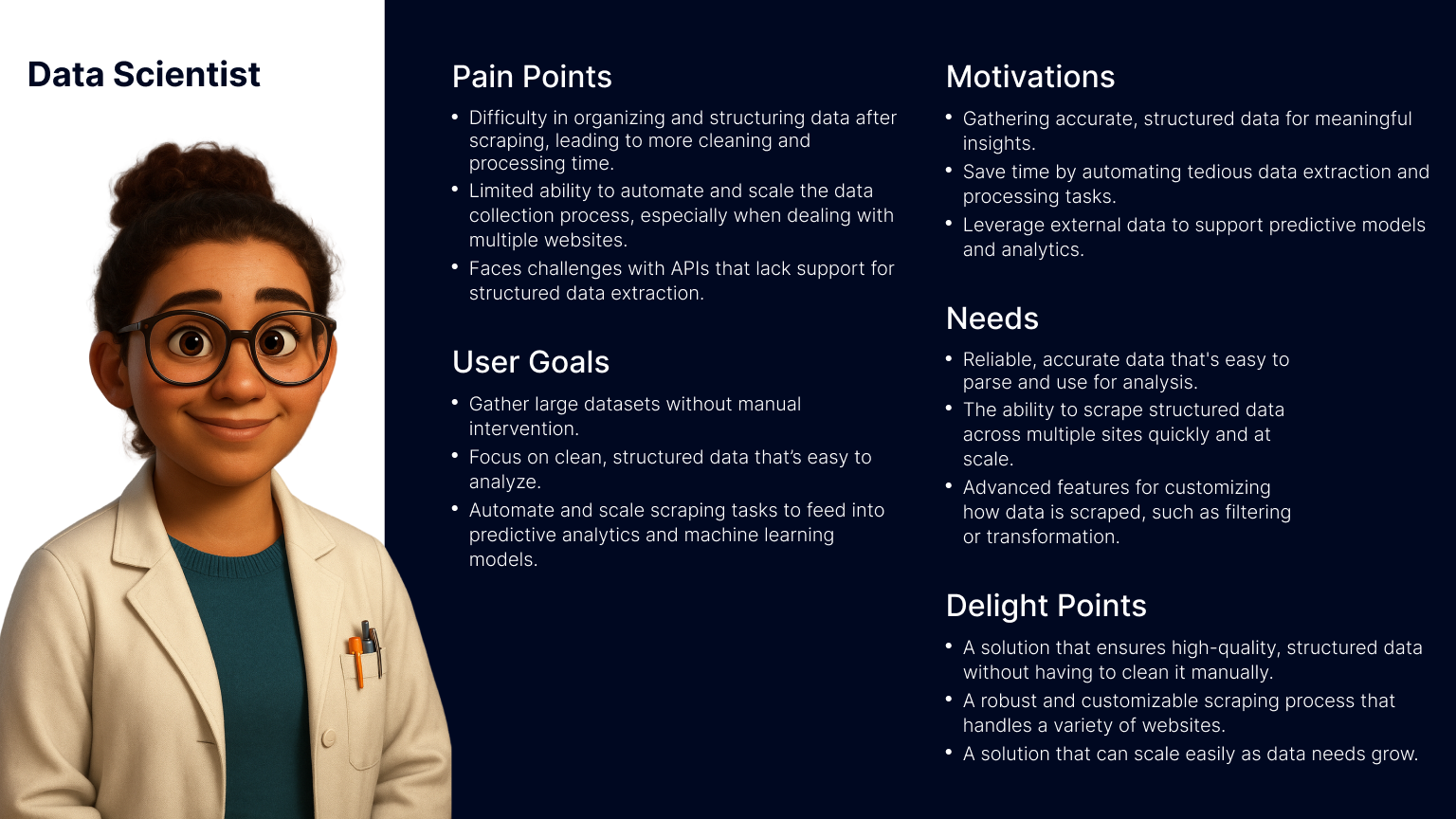 Since Bright Data is not the only company offering web scraping solutions, aligning with familiar interaction models was a strategic move to reduce user friction and increase trust. As part of the discovery phase, I also set out to validate our understanding of the target audience. However, it quickly became clear that we lacked sufficient data about our primary user personas.