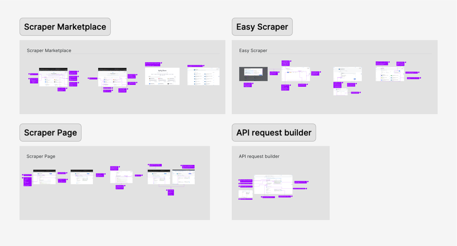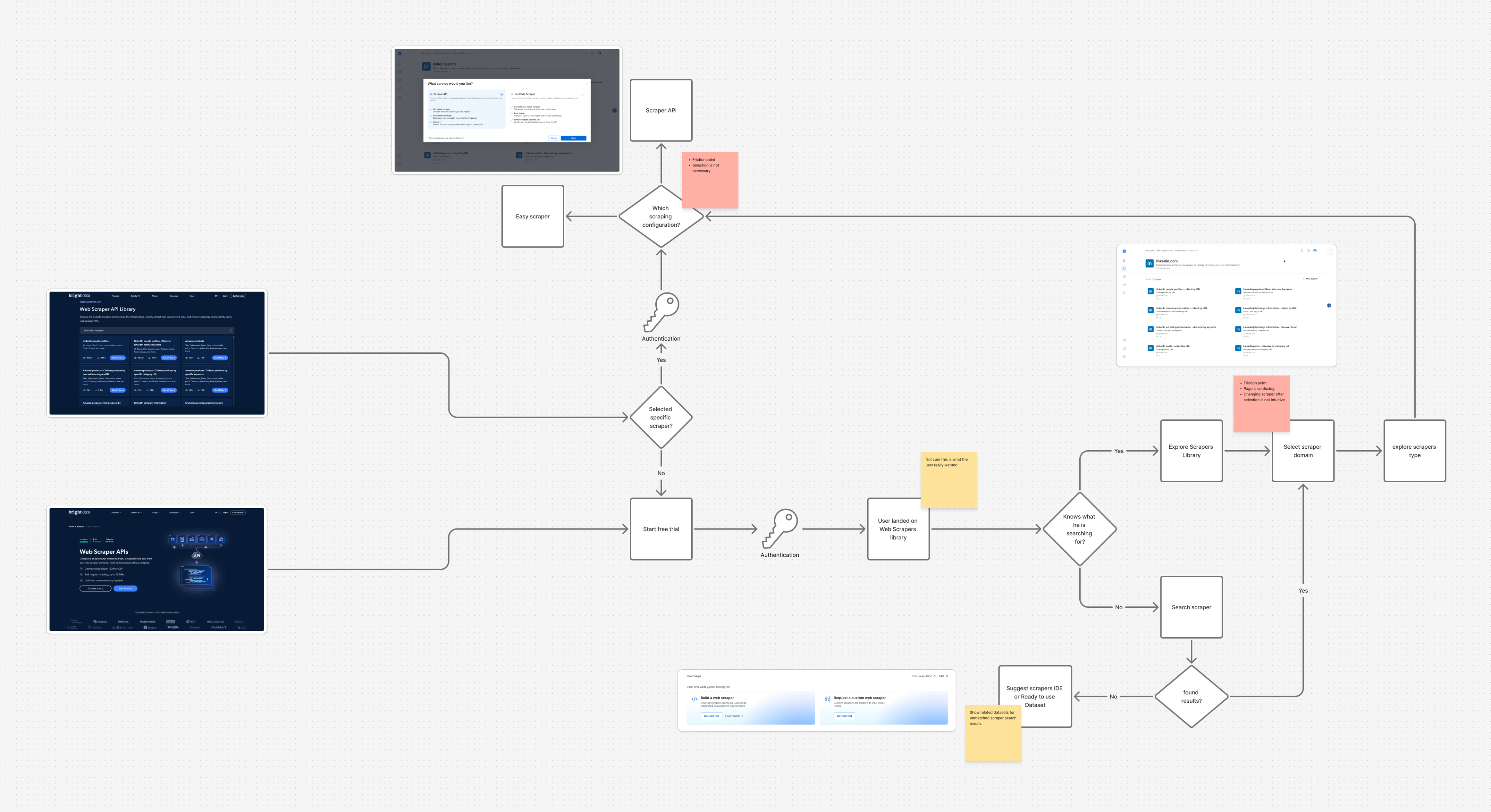 After defining our user personas, I turned to the existing product experience to map key user flows, from landing on the Web Scraper API library to configuring and executing a scraper. This end-to-end review helped surface critical friction points, misaligned interactions, and moments of user hesitation. By analyzing these flows, we were able to clarify our design goals and establish how we would measure success in the improved experience.