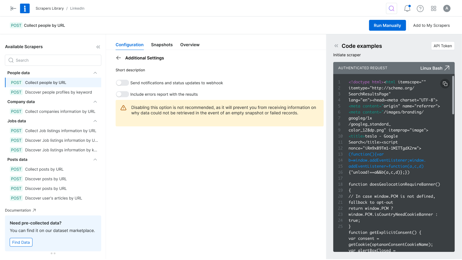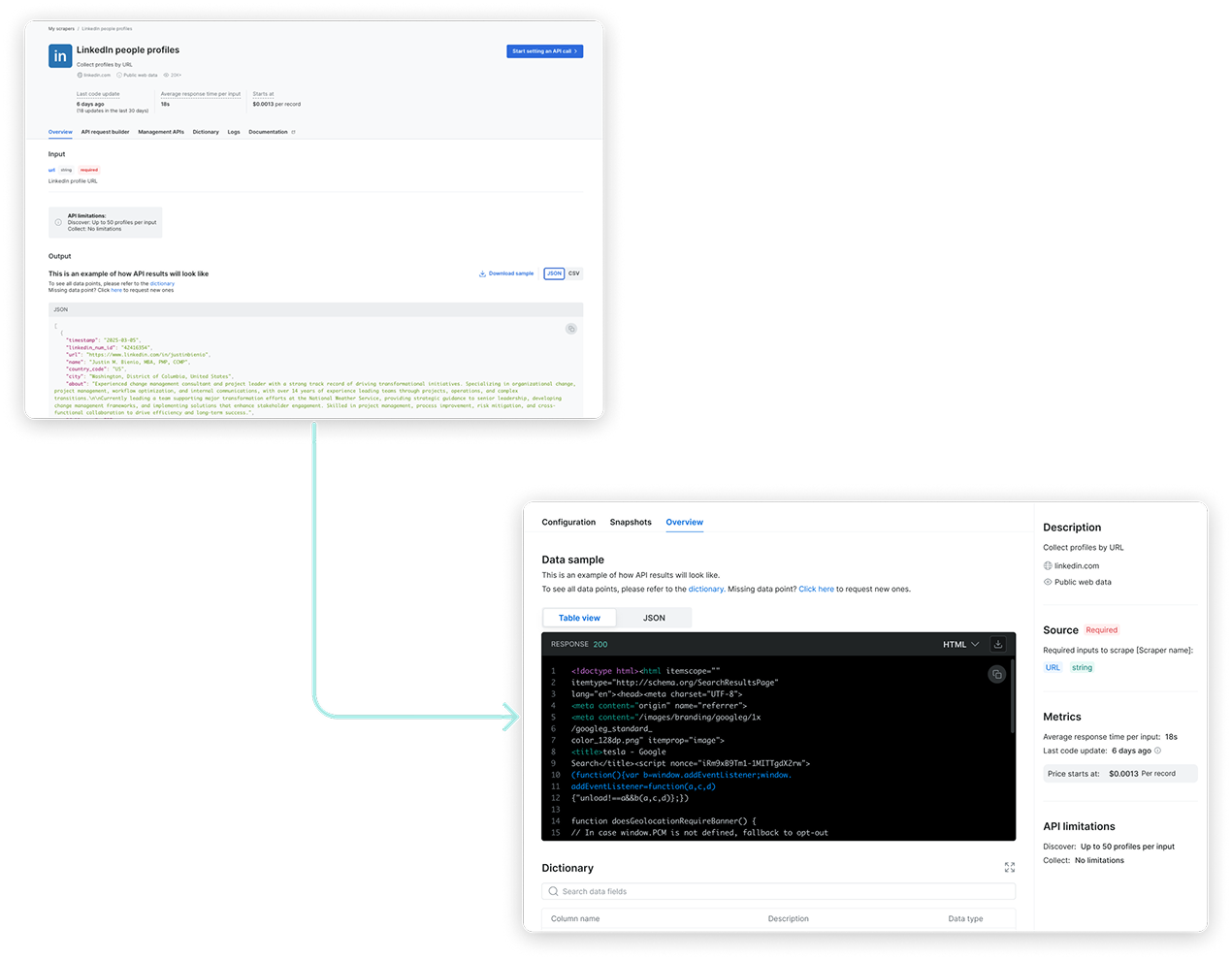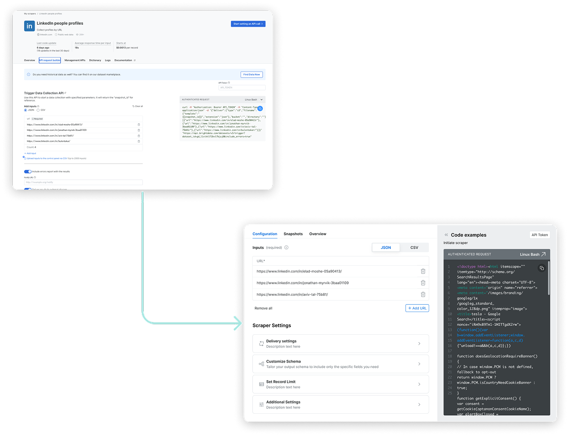In the original flow, users landed on the scraper overview page, but product metrics showed they quickly skipped past it to reach the configuration page. To reduce friction and align with user intent, we reordered the tabs to place configuration first and focused the interface on only the essential settings. This simplified the experience, reduced cognitive load, and helped users reach value faster.