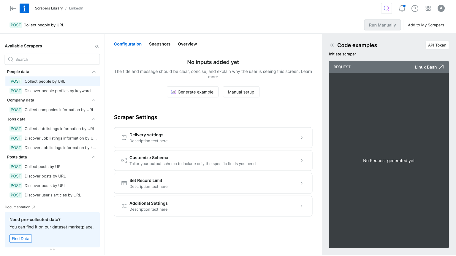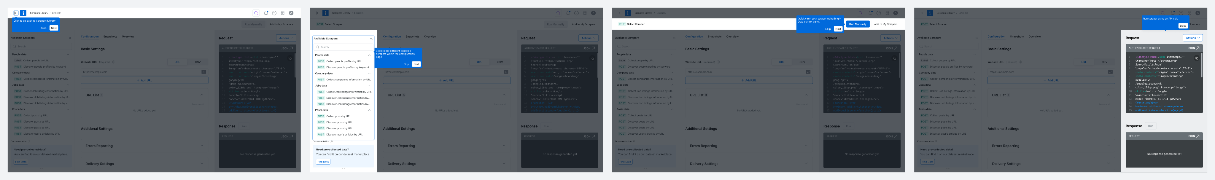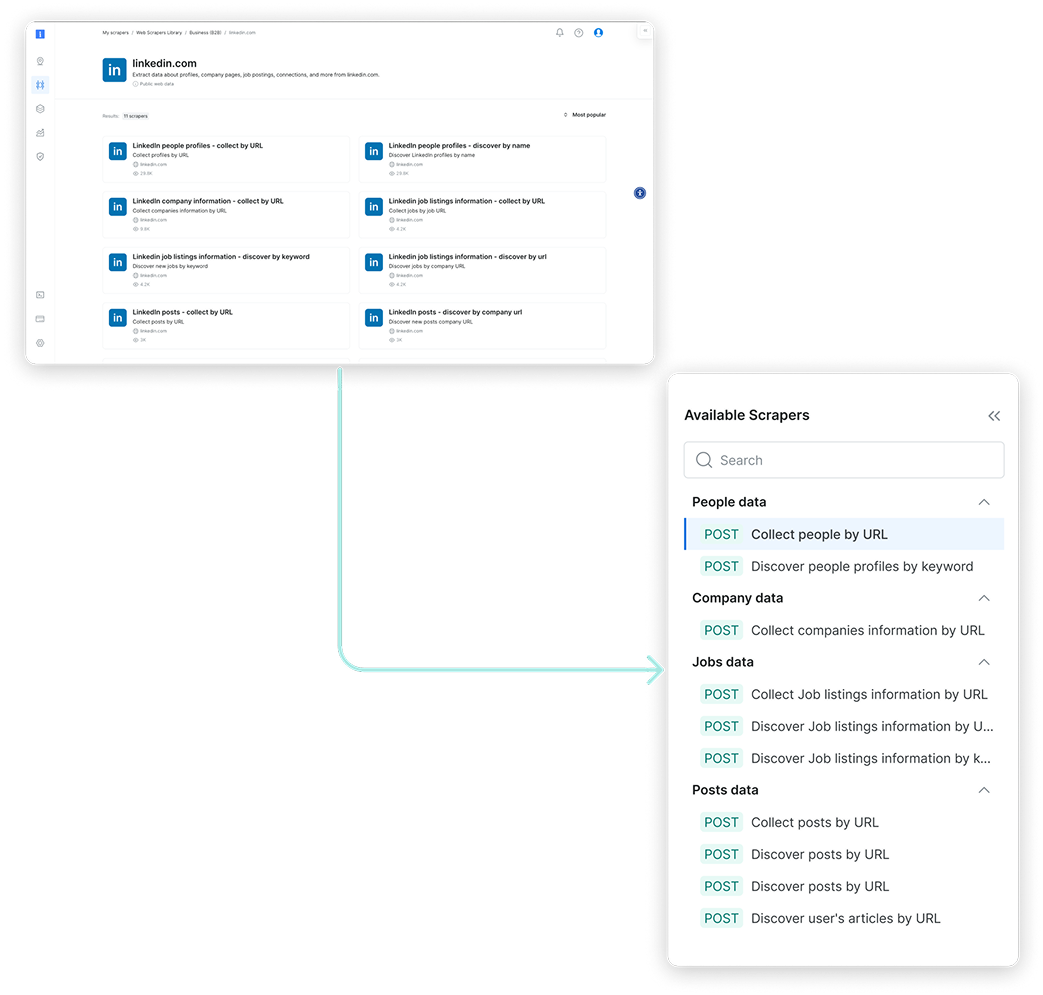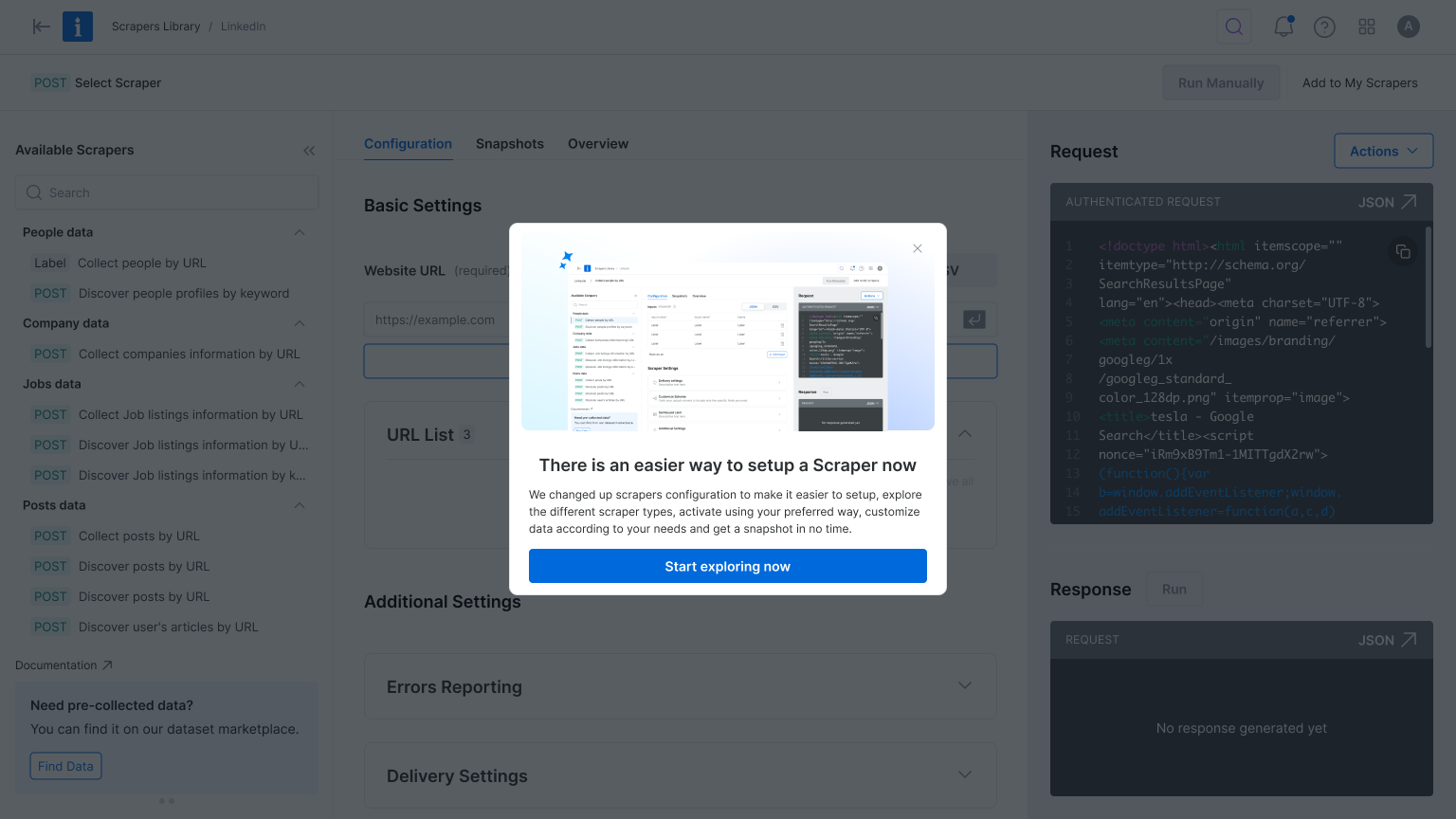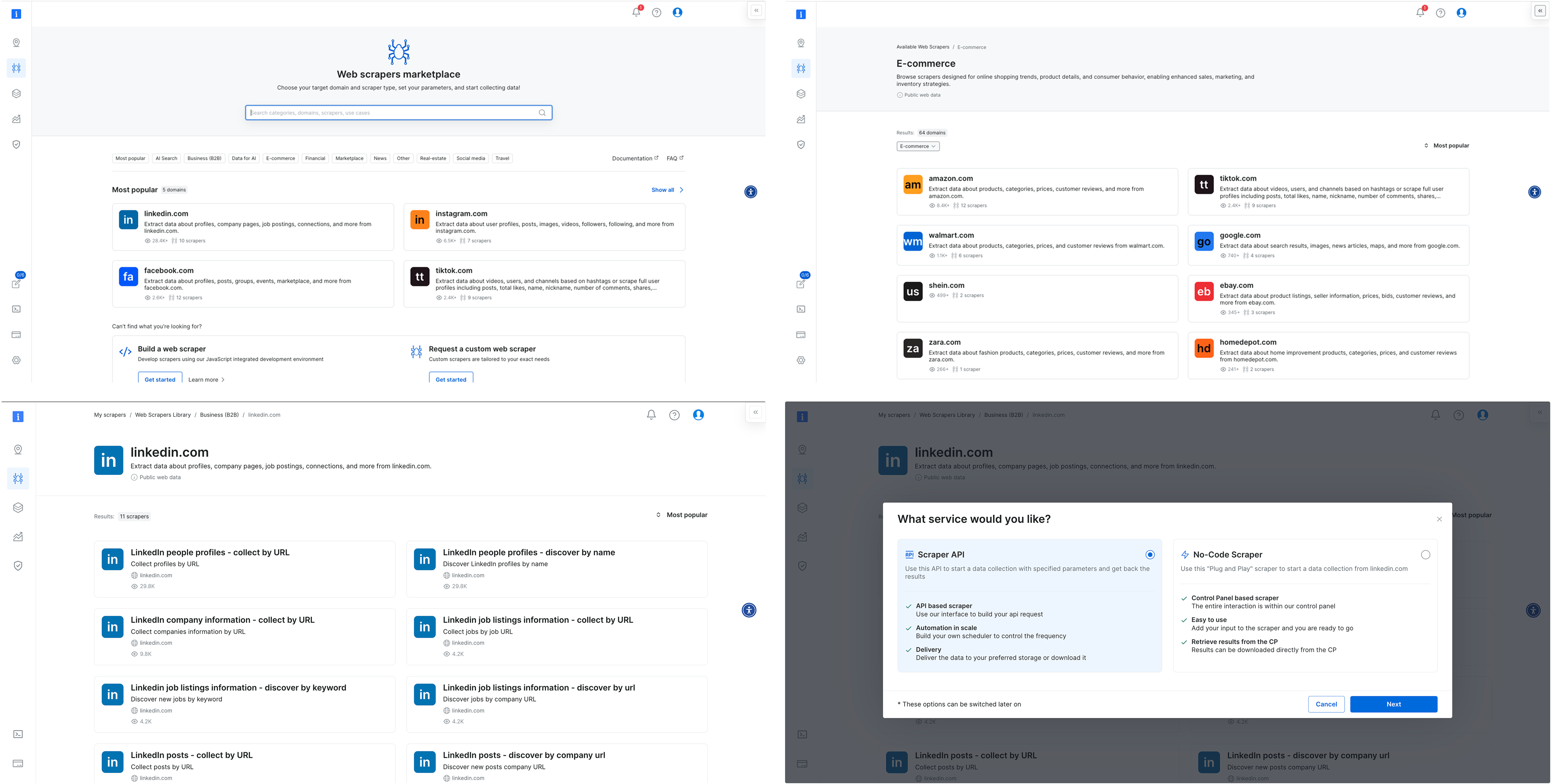 The original interface made it hard to differentiate between scrapers—each looked nearly identical, with little context to support decision-making. Once a scraper was selected, switching to another meant starting the entire setup process from scratch. To streamline exploration and reduce friction, we introduced a tree view for easier navigation within each domain, enabled flexible scraper switching mid-flow, and highlighted the delivery method to help technical users make faster, more informed choices.