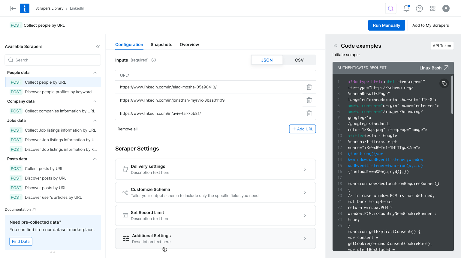 You are a data-driven professional looking to stay on top of competitor pricing, customer reviews, or hiring trends.But manually gathering that information from dozens of websites takes too much time. Web Scraper API does the heavy lifting for you, automatically collecting and organizing information from over 120 popular websites into a clear, usable format, so you can spend more time making decisions and less time hunting for data.